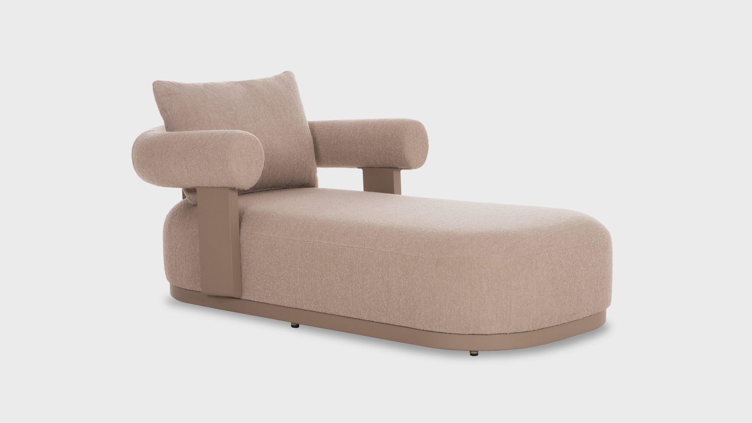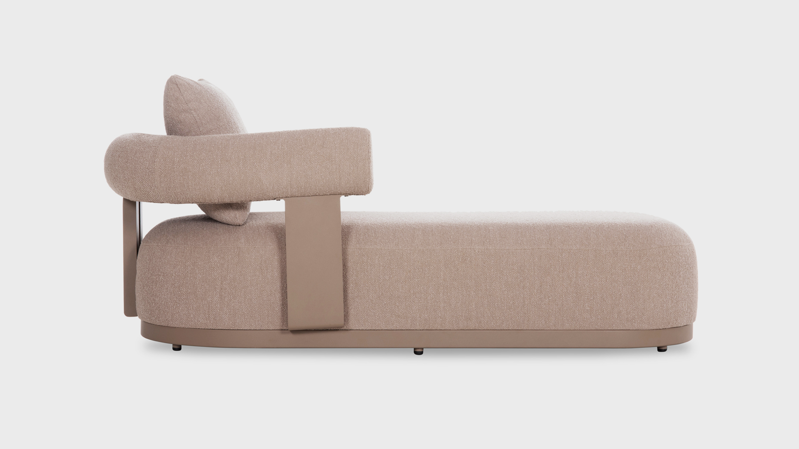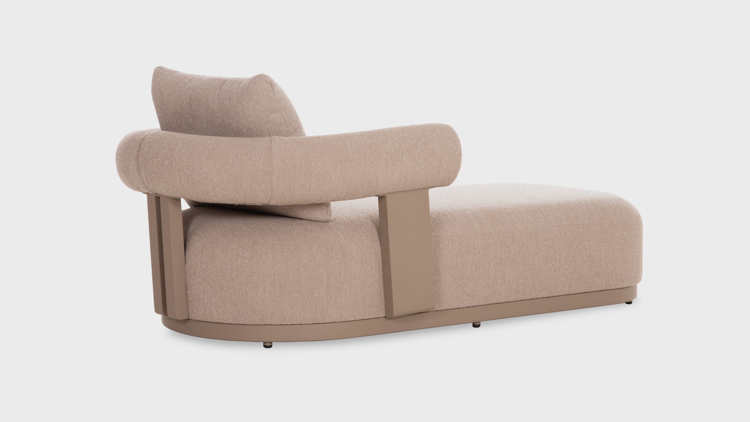 DECCARD daybed εξωτερικού χώρου με σκελετό αλουμινίου, σταθερή ημικυκλική πλάτη με μαξιλάρι & παχύ στρώμα καθίσματος. Bαμμένος σκελετός με ηλεκτροστατική βαφή. Το μαξιλάρι πλάτης είναι με αφαιρούμενο κάλυμμα. Διατίθεται σε δύο χρωματισμούς: σκούρο γκρι & μπεζ.