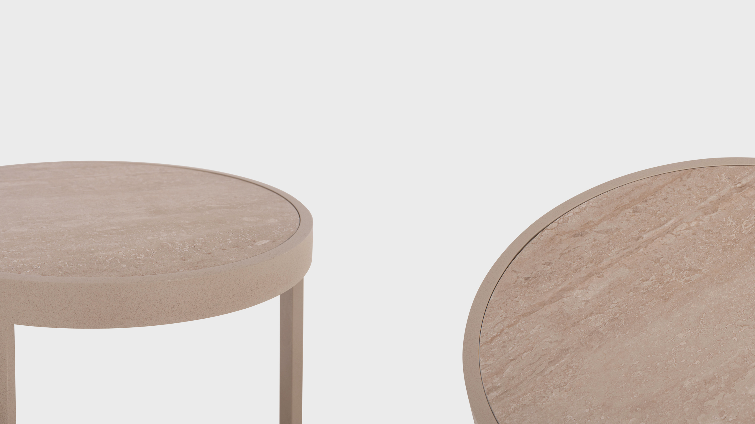Βοηθητικό τραπεζάκι εξωτερικού χώρου DEVIOUS με σκελετό από αλουμίνιο βαμμένο με ηλεκτροστατική βαφή & επιφάνεια από Sintered Stone (πυροσυσσωματωμένη πέτρα).