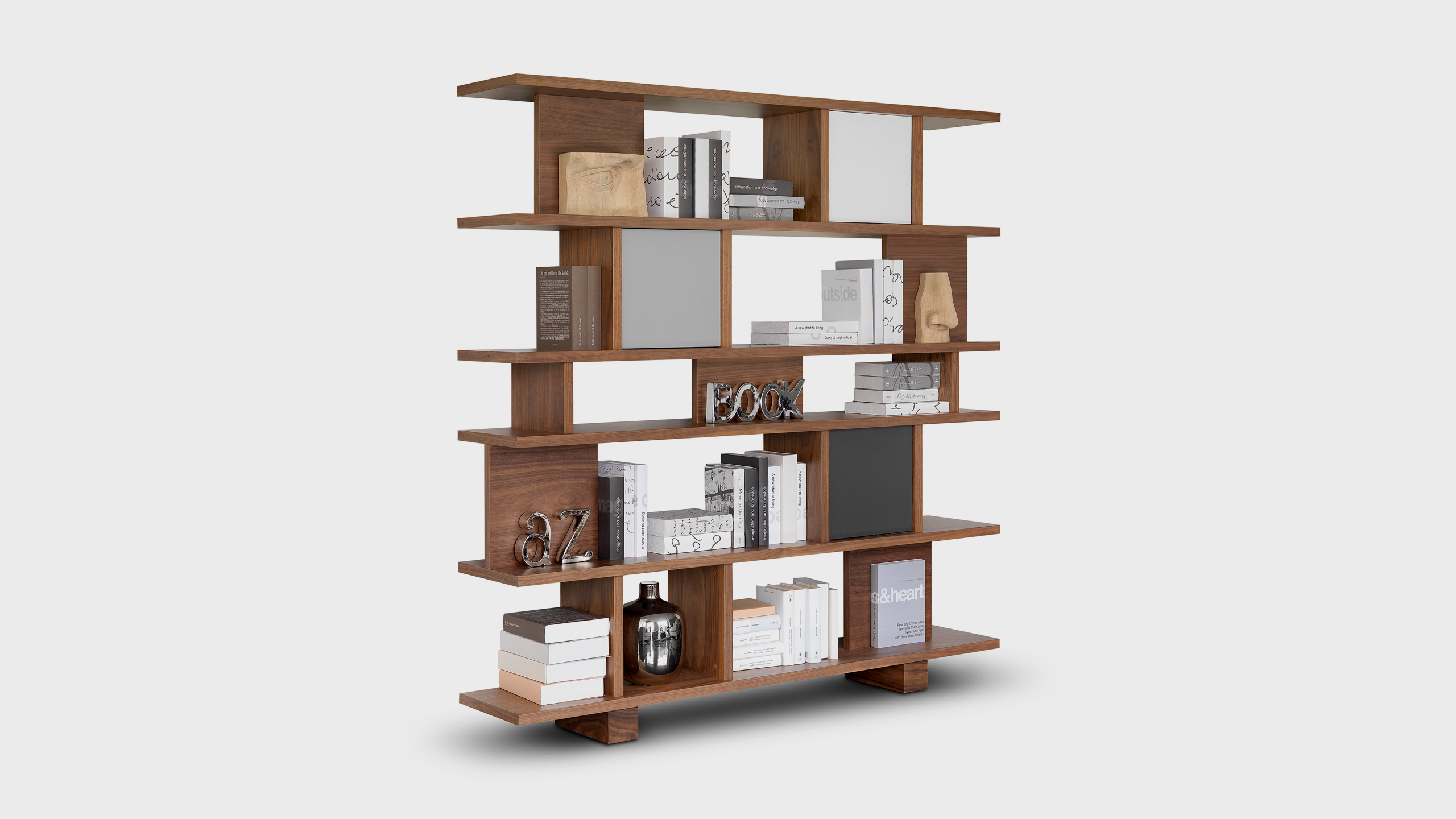 Επιτοίχια ξύλινη βιβλιοθήκη από καρυδιά, δρυ (σε διάφορα χρώματα) ή λάκα ματ, με ανοιχτά και κλειστά στοιχεία.