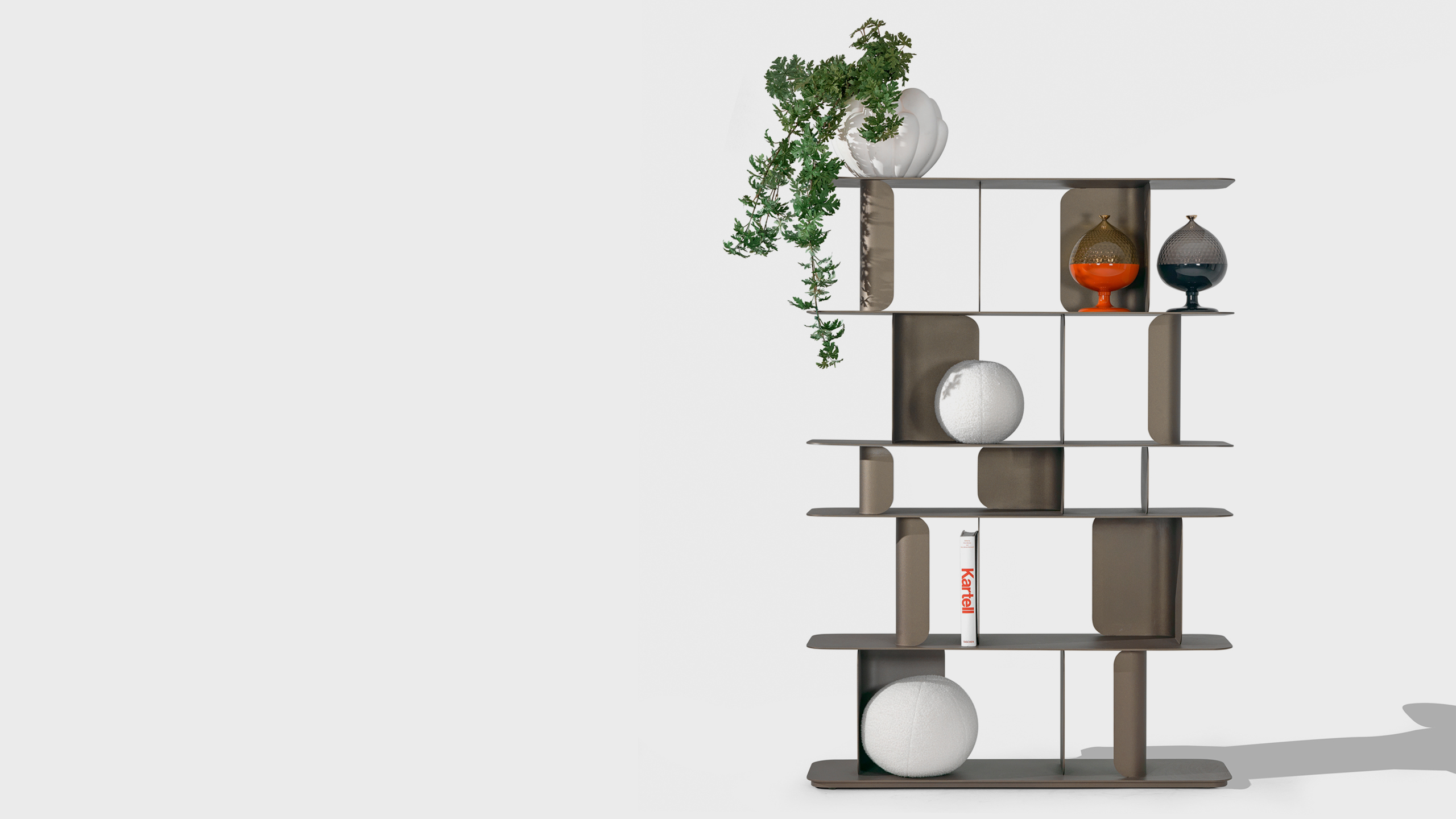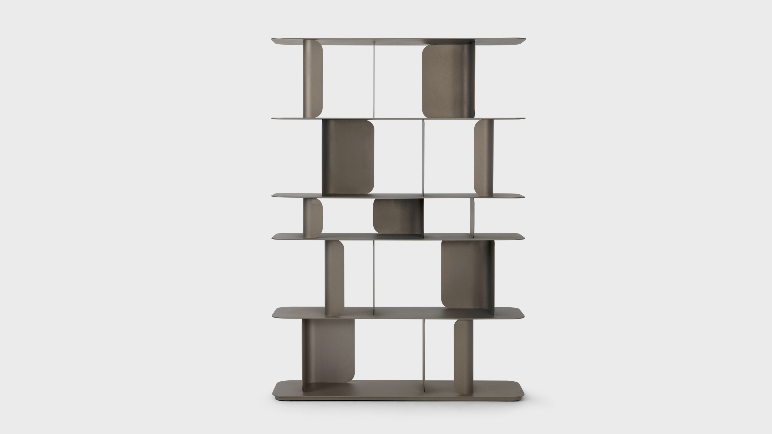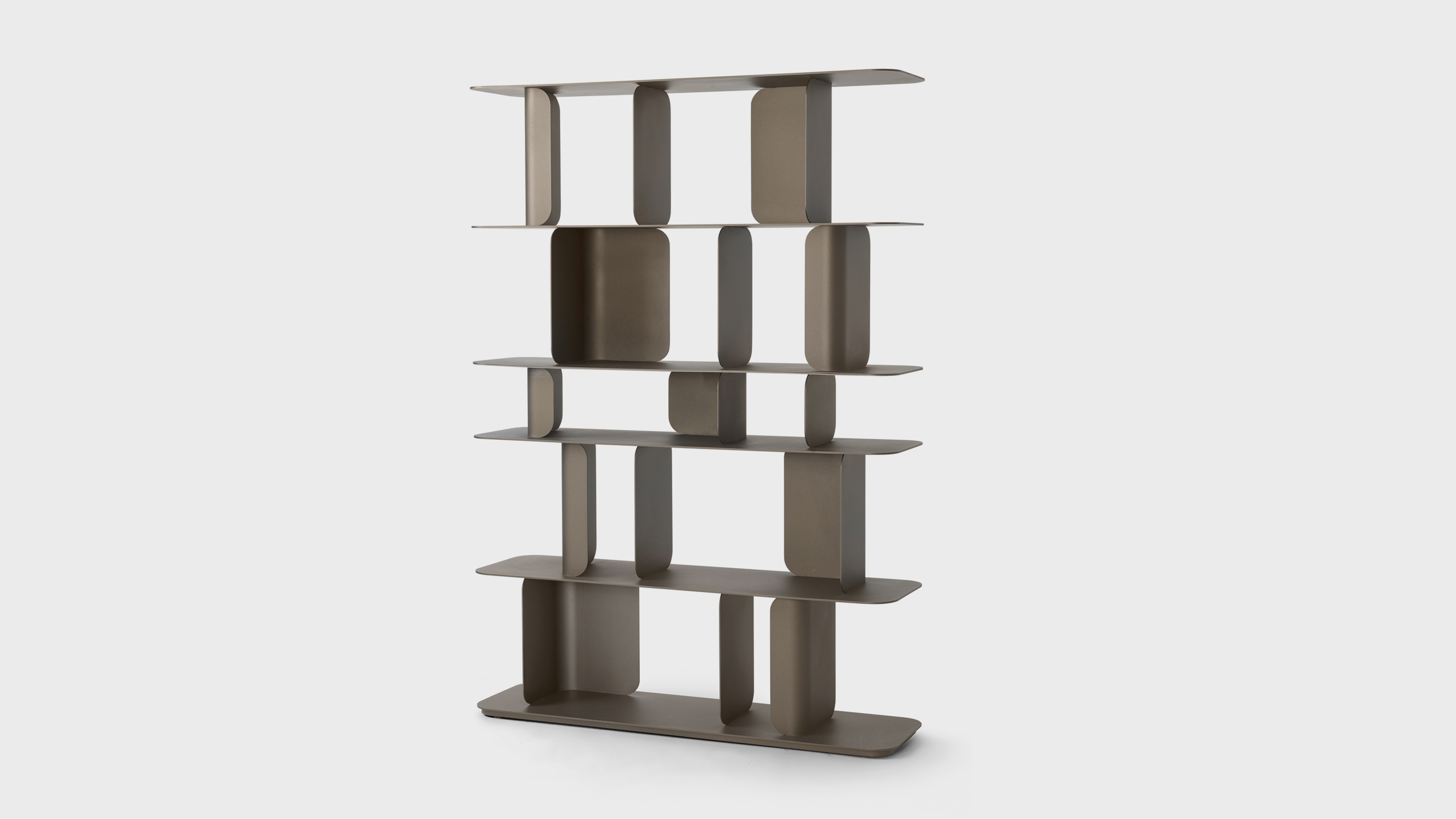 Ελεύθερη βιβλιοθήκη Miro με μεταλλικό σκελετό και μεταλλικά ράφια & διαχωριστικά (σε ποικιλία χρωμάτων).