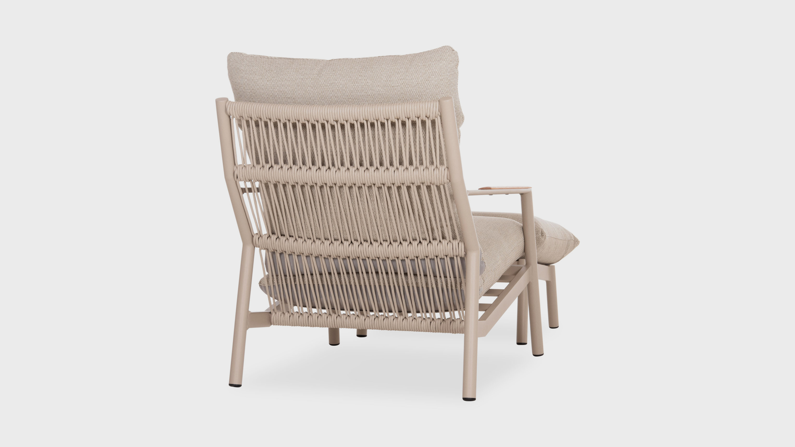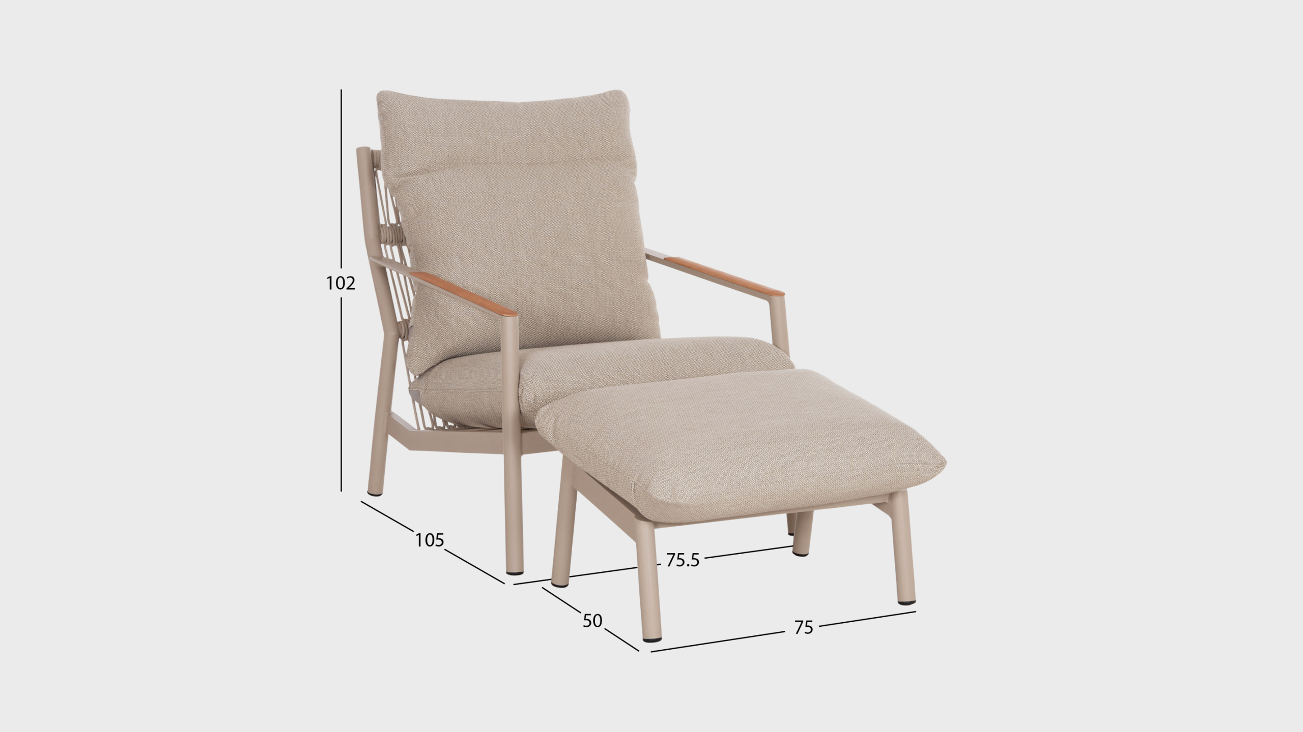 Πολυθρόνα εξωτερικού χώρου OBLIVION με σκελετό από αλουμίνιο βαμμένο με ηλεκτροστατική βαφή, πολυεστερικό σχοινί στην πλάτη & λεπτομέρεια με ξύλο teak που «ντύνει» τα μπράτσα. Διατίθεται με σκαμπό.