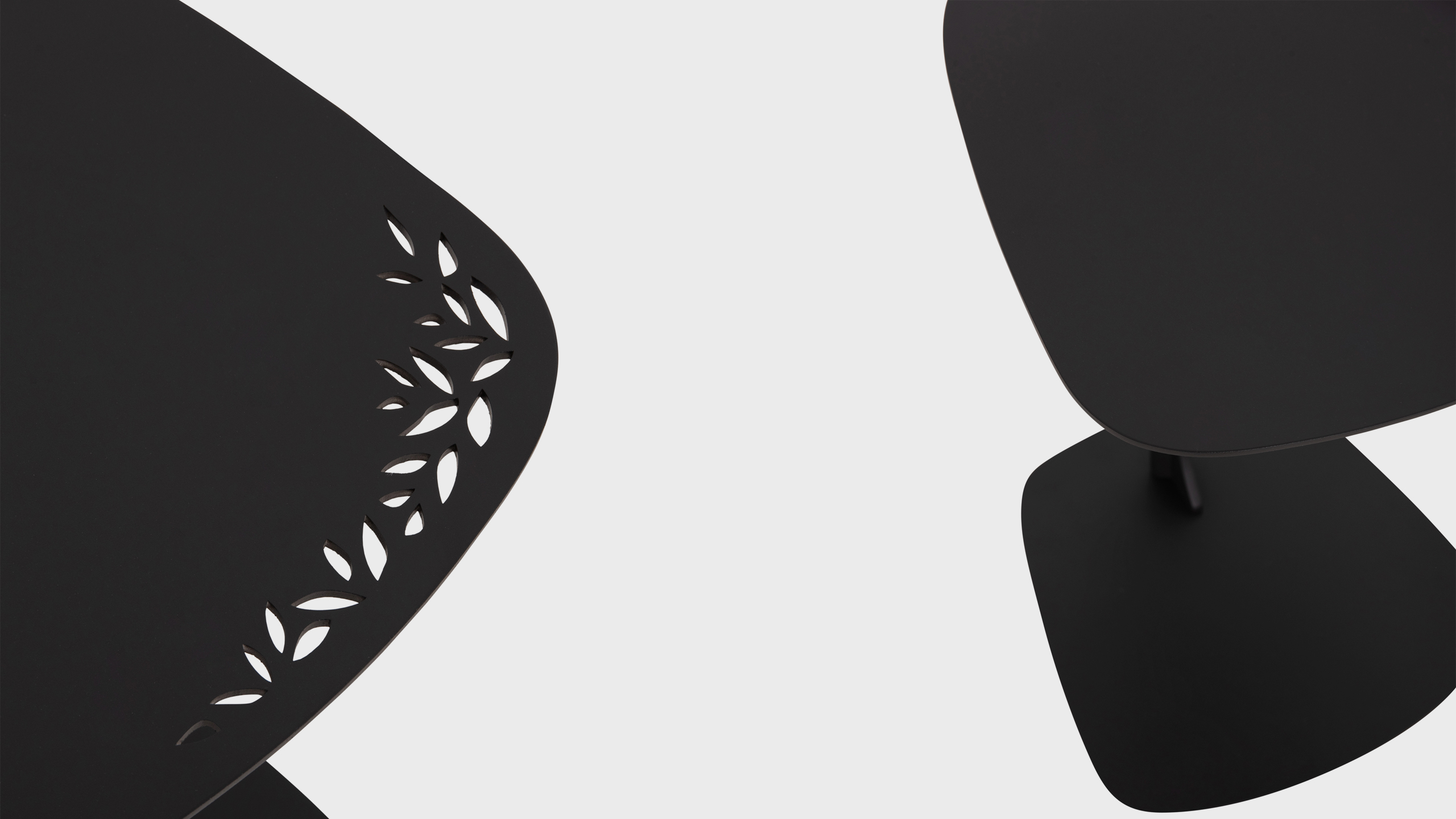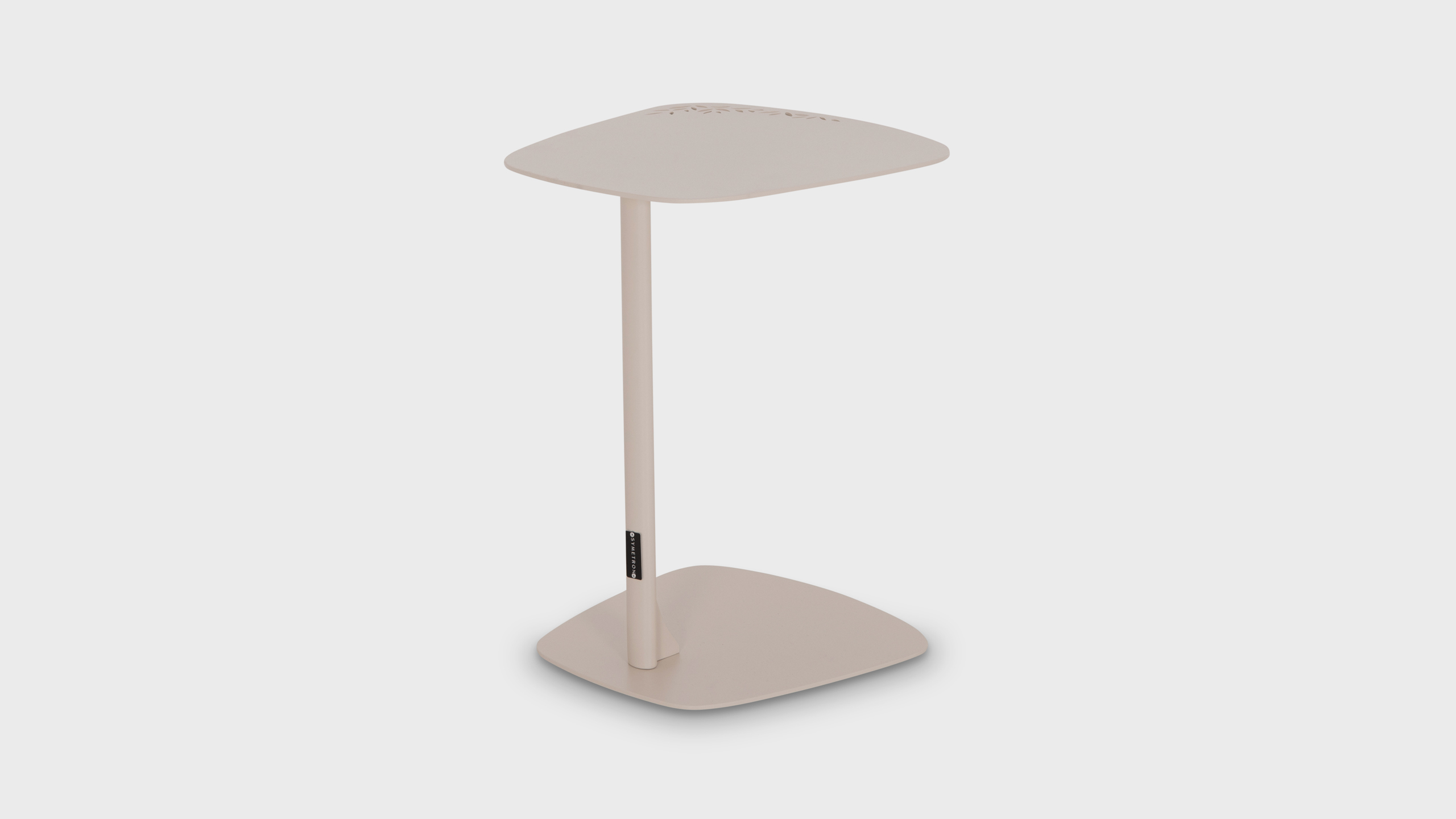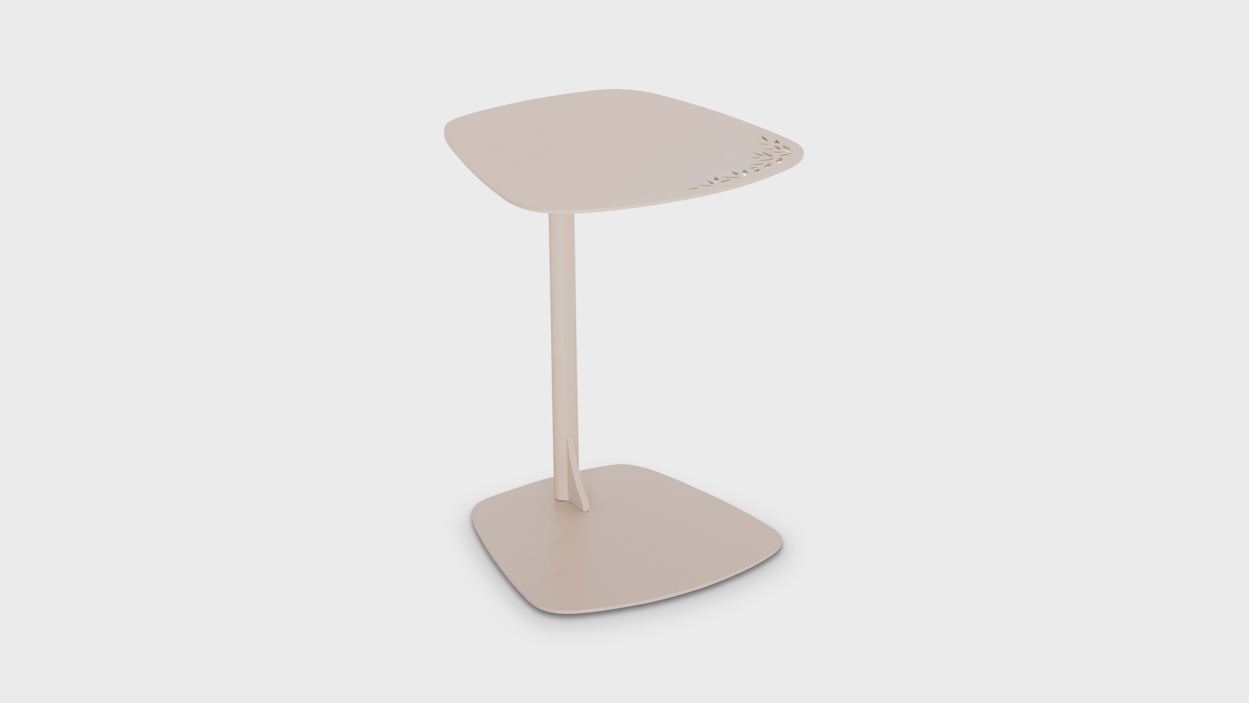 Τραπεζάκι εξωτερικού χώρου SOFFBORD με σκελετό εξ ολοκλήρου από αλουμίνιο βαμμένο με ηλεκτροστατική βαφή. Ξεχωρίζει το σχήμα τόσο της βάσης όσο και της επιφάνειας η οποία έχει σκαλιστό «τρυπητό» σχέδιο στην μία γωνία της.  Διατίθεται σε δύο χρωματισμούς: σκούρο γκρι & μπεζ.