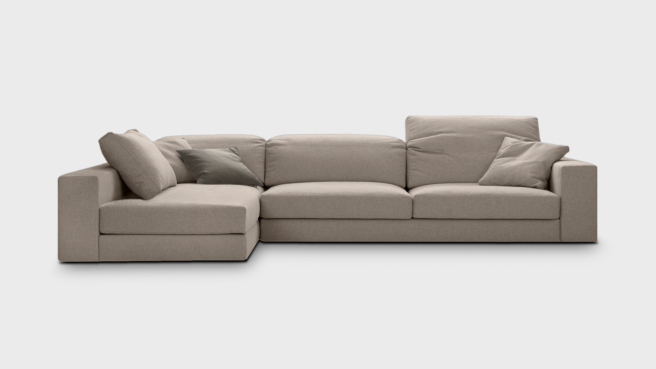 Σύστημα καθιστικού με χαρακτηριστική ανάκλιση στα μαξιλάρια πλάτης & εύχρηστους μεταλλικούς συνδέσμους σταθεροποίησης. Τα διακοσμητικά μαξιλάρια διατίθενται στο ύφασμα του καναπέ.