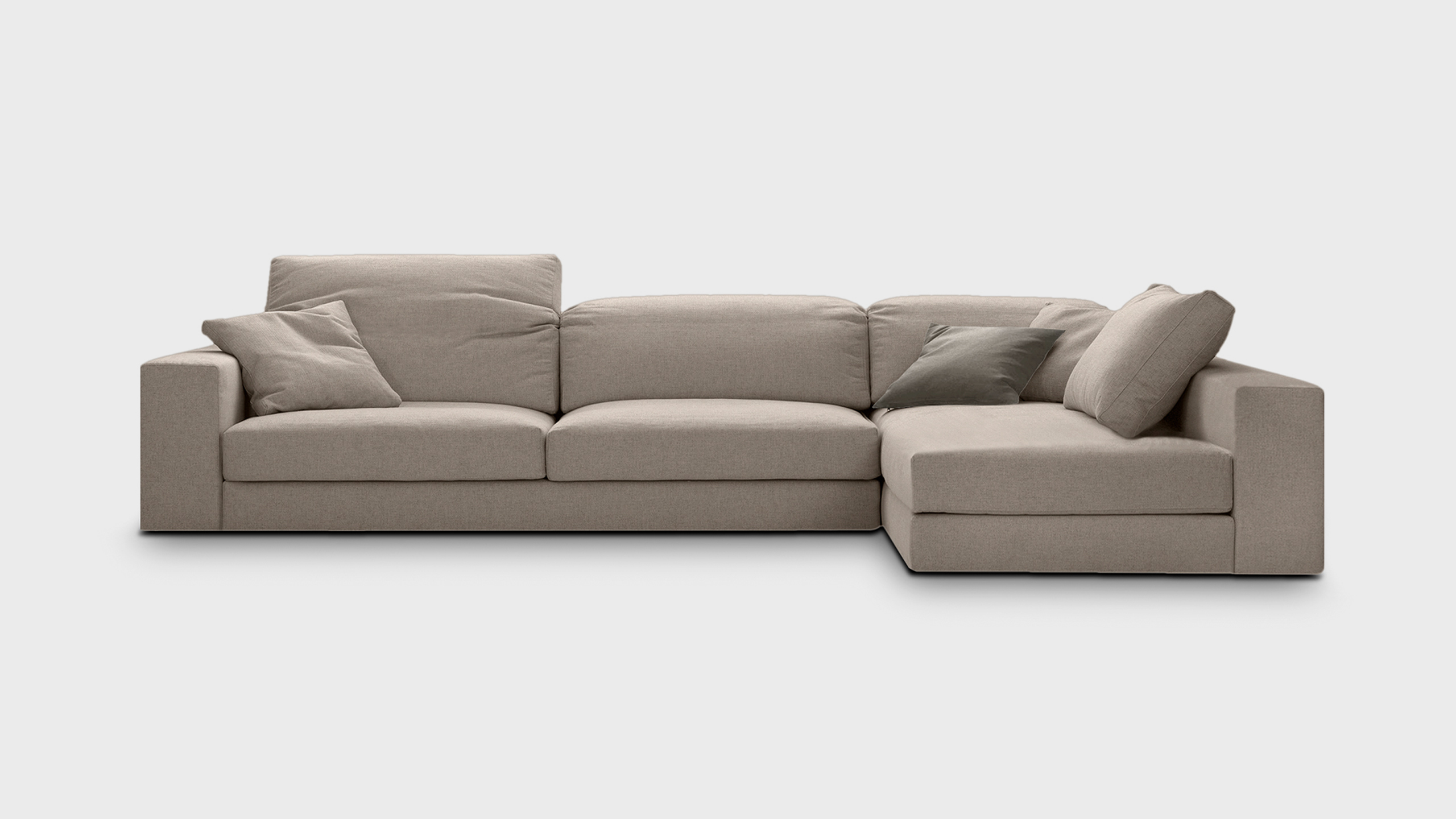 Σύστημα καθιστικού με χαρακτηριστική ανάκλιση στα μαξιλάρια πλάτης & εύχρηστους μεταλλικούς συνδέσμους σταθεροποίησης. Τα διακοσμητικά μαξιλάρια διατίθενται στο ύφασμα του καναπέ.